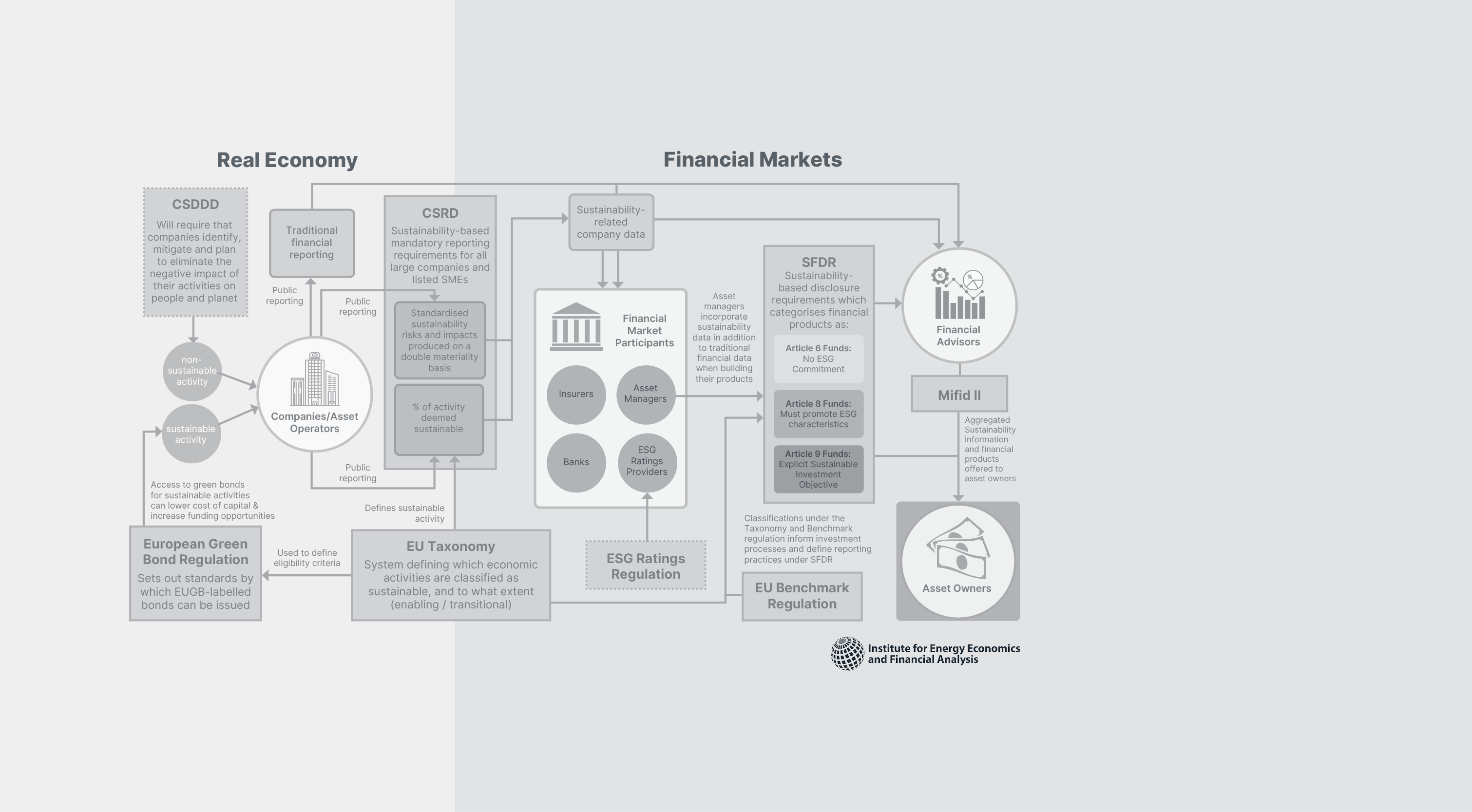 The regulatory landscape is highly interdependent and relies on harmonisation of approach across directives. It is worth noting that the EU is an early adopter in this space meaning that much of the legislation is the first of its kind. As a result, we can expect refinement over time as the industry adjusts. IEEFA will continue to monitor developments as part of its mission to accelerate the transition to a diverse, sustainable and profitable energy economy.